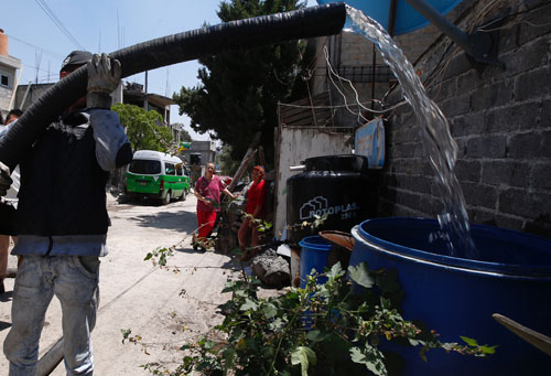 El déficit de agua en la delegación Iztapalapa se incrementa durante la temporada de estiaje, por lo que es recurrente el suministro del líquido por medio de pipas, como ocurrió ayer en la colonia Cerro de la Estrella, donde los pobladores almacenan el recurso en todo tipo de recipientes. En total son 69 colonias de la demarcación que reciben el agua cada tres o cuatro días Foto Francisco Olvera