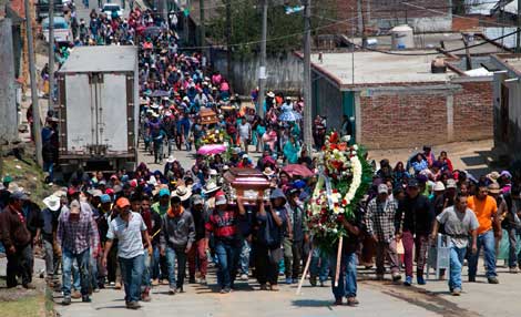 Habitantes de la localidad realizaron las honras fúnebres a los tres comuneros que murieron en la incursión y enfrentamiento con la policía el pasado miércoles. En Morelia, se manifestaron frente a las instalaciones de la Procuraduría General de Justicia del Estado para demandar una investigación a fondo y deslindar responsabilidades; también exigieron la liberación de 48 compañeros. La organización Nación Purépecha Zapatista afirmó que ninguno de los fallecidos estaba armado. Bernardo Corona, secretario de Seguridad Pública, reiteró que los agentes estatales fueron emboscados. La Comisión Nacional de los Derechos Humanos informó que atraerá el caso Foto Afp