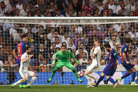 La Pulga marcó dos goles, participó en otro y forzó la expulsión de Sergio Ramos para impulsar la remontada del equipo blaugrana por 3-2 en la cancha del equipo merengue para dar un vuelco en la liga española, que ahora encabezan ambos equipos empatados en 75 puntos, a cinco fechas para finalizar la temporada. En la imagen, el astro argentino realiza la milimétrica anotación del triunfo en el minuto 92 Foto Xinhua