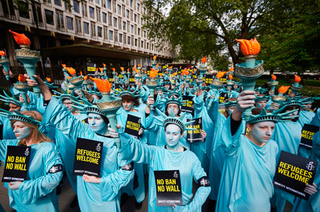 No prohibiciones, no murosy ‘‘Bienvenidos refugiados’’, integrantes de Amnistía Internacional, disfrazados de la Estatua de la Libertad, se manifestaron frente a la embajada de Estados Unidos en Londres, en vísperas de que se cumplan 100 días del gobierno de Donald Trump Foto Afp