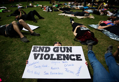 Performance en Atlanta, en el contexto de la visita del presidente Donald Trump, quien pronunció un discurso durante la conferencia anual de la Asociación Nacional del Rifle, poderoso organismo de cabildeo en favor del uso de las armas, que le dio su apoyo sin reservas en toda la campaña electoral.