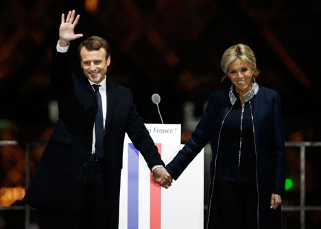 Emmanuel Macron, presidente electo de Francia, y su esposa Brigitte saludan a simpatizantes durante la celebración de la victoria en las afueras del Museo de Louvre.