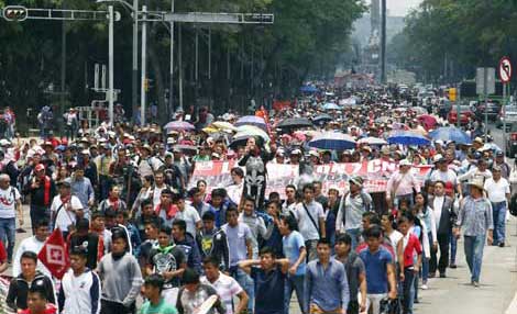 Miles de profesores exigieron la abrogación de la reforma educativa, la reinstalación de docentes despedidos, la reapertura de la mesa de negociación con el gobierno federal y la presentación con vida de los 43 normalistas de Ayotzinapa desaparecidos. En Ciudad de México (imagen), el magisterio disidente, tras entregar un pliego petitorio en Los Pinos, consideró que la respuesta oficial resulta