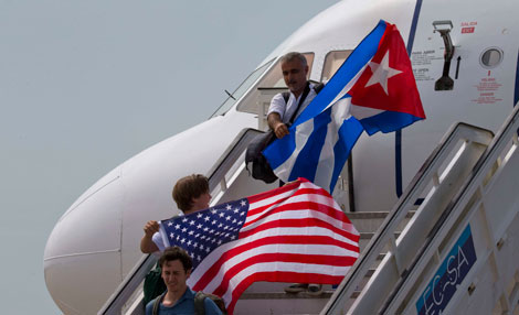 Según trascendidos de la Casa Blanca, el presidente Donald Trump modificará varias regulaciones sobre viajes y esquemas de negocios con la isla promovidos por su antecesor, Barack Obama, pero no anulará la apertura diplomática ni cerrará canales de inversión. Un intenso cabildeo de empresarios, gobernadores y agrupaciones cubano-estadunidenses lograron frenar los cambios exigidos por ultraconservadores de Miami. En la imagen, pasajeros despliegan banderas de ambos países tras el aterrizaje de una nave de la aerolínea JetBlue en Santa Clara, en agosto de 2016 Foto Ap