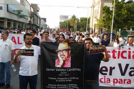 Unas mil personas marcharon en Culiacán, Sinaloa, para exigir el esclarecimiento del asesinato de Javier Valdez, corresponsal de La Jornada y cofundador del semanario Riodoce. Los organizadores leyeron un manifiesto con seis peticiones que entregaron a las autoridades estatales, entre ellas, replantear las medidas de seguridad en la entidad Foto Cristian Díaz