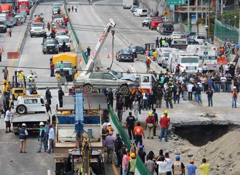 Más de cinco horas tardaron rescatistas para sacar los cadáveres de Juan Mena Ruiz, de 59 años, y de su hijo Juan Mena Romero, de 33, tripulantes del vehículo Jetta, con placas de Guerrero, quienes cayeron en un socavón que abarcó cuatro de cinco carriles del sentido Acapulco-México, y con seis metros de profundidad Foto Rubicela Morelos