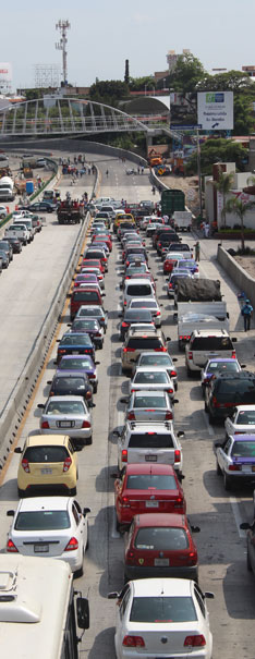 Desde las 6 de la mañana de ayer el Paso Exprés quedó cerrado en ambos sentidos a la altura de la oquedad que se abrió cerca del kilómetro 93 de la Autopista del Sol, en la colonia Chipitlán. Miles de automovilistas, autobuses de pasajeros, transportistas y vehículos de empresas que viajaban del estado de Guerrero hacia la capital del país, y viceversa, quedaron varados durante al menos siete horas Foto Rubicela Morelos