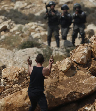 Nuevos choques entre palestinos e israelíes –que dejaron ayer dos árabes muertos– derivados de las tensiones por el disputado lugar sagrado conocido como Monte del Templo, por los judíos, y Explanada de las Mezquitas, para los musulmanes, en la ciudad vieja de Jerusalén. En la imagen, un joven reta a soldados israelíes en Kubar, en el este de Ramala, Cisjordania, adonde Tel Aviv ha enviado más tropas mientras colocó a sus fuerzas en alerta máxima Foto Afp