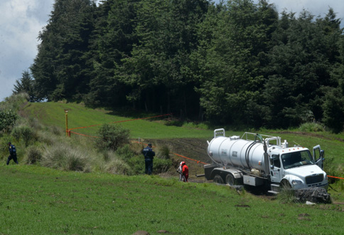 Vecinos de Topilejo, en la delegación Tlalpan, advirtieron la mañana de ayer sobre la fuga de combustible a causa de una toma clandestina en un ducto de Petróleos Mexicanos, en el kilómetro 40+500 de la carretera libre México-Cuernavaca. Elementos de Seguridad Pública de la Ciudad de México hallaron en el lugar mangueras, bidones y herramientas para la extracción ilegal de combustible Foto Cuartoscuro