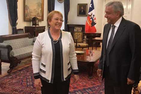 La presidenta de Chile, Michelle Bachelet, recibió en el Salón de Audiencias del recinto oficial a Andrés Manuel López Obrador, titular del Comité Ejecutivo Nacional de Morena, reportó la oficina de prensa de la mandataria. El político tabasqueño comenzó ayer una gira por Sudamérica, que incluye también una reunión con el presidente de Ecuador, Lenín Moreno Garcés. En un mensaje difundido en su cuenta de Facebook el pasado lunes, López Obrador expuso que las citas tienen el propósito de informar sobre nuestro movimiento Foto Presidencia de Chile
