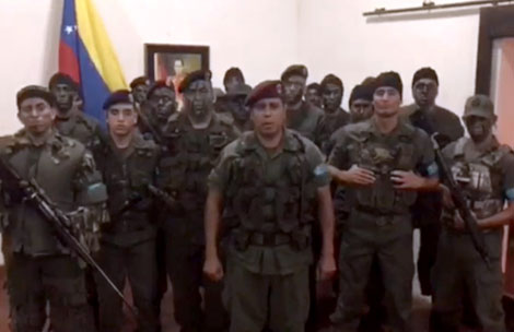 El capitán retirado Juan Carlos Caguaripano (centro) divulgó en Internet un video de la rebelión que encabezó, junto con una veintena de seguidores, para que todos los uniformados del país desconocieran al presidente Nicolás Maduro. La fuerzas armadas venezolanas informaron que controlaron el ataque al cuartel en la ciudad de Valencia, con saldo de dos muertos y ocho detenidos. No quedó claro si el responsable del grupo agresor fue apresado Foto Afp