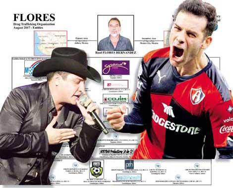 El cantante grupero Julión Álvarez, el narcotraficante Raúl Flores Hernández y el futbolista Rafael Márquez con los reportes que divulgaron autoridades estadunidenses sobre 42 empresas donde presuntamente se lavaba dinero Fotos Ap y Afp, así como la ficha del Departamento del Tesoro estadunidense