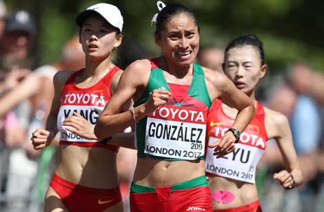 La marchista mexicana cruzó la línea final a sólo un segundo de la china Jiayu Yang (1:26.18, izquierda), quien se llevó la presea dorada en la prueba de 20 kilómetros.
