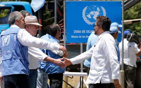 El presidente Juan Manuel Santos (de sombrero) saluda a Iván Márquez, uno de los dirigentes del movimiento insurgente. Con la entrega del último cargamento de armas a una misión de la Organización de las Naciones Unidas, el conflicto realmente termina y comienza una fase nueva en la vida de Colombia, proclamó el mandatario. El emotivo acto se realizó en Pondores, en la Costa Caribe, una de las 26 zonas donde los rebeldes se concentraron tras la firma de la paz en noviembre. El líder guerrillero ratificó que en adelante las FARC se enfocarán en la lucha política Foto Ap