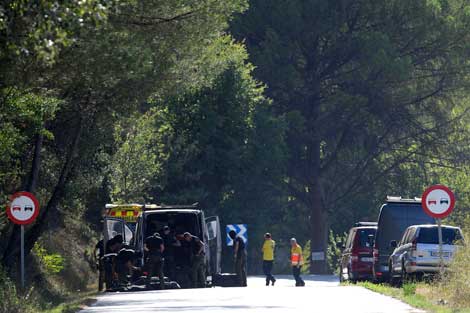 Policías especializados en desactivación de bombas revisan el cuerpo de Younes Abouyaaquob, marroquí de 22 años, quien antes de ser abatido en la localidad de Subirats, un pueblo a 50 kilómetros de Barcelona, advirtió que haría explotar un cinturón con explosivos, que resultó falso. El yihadista protagonizó el atropello masivo en La Rambla, que costó la vida a 14 personas y heridas a 130. En su huida apuñaló a otra persona para quitarle su auto Foto Afp