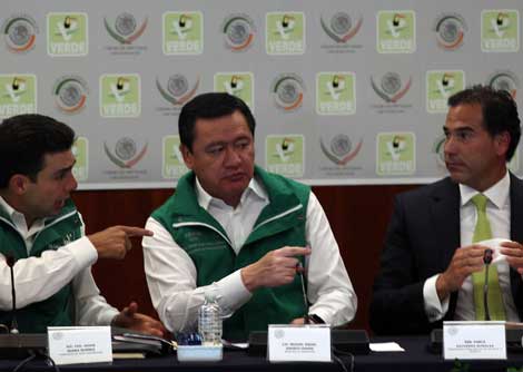 Miguel Ángel Osorio Chong, secretario de Gobernación, tuvo ayer un encuentro en el Senado con legisladores del Partido Verde Ecologista de México, en el que abordaron diversos temas. Lo acompañan Jesús Sesma (izquierda), coordinador de ese partido en la Cámara de Diputados, y Pablo Escudero, presidente del Senado Foto José Antonio López