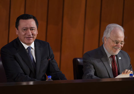 Miguel Ángel Osorio Chong, secretario de Gobernación, y Francisco José Eguiguren Praeli, presidente de la Comisión Interamericana de Derechos Humanos (CIDH), durante la inauguración de las sesiones extraordinarias del organismo internacional, que se realizarán esta semana en Ciudad de México Foto Cristina Rodríguez