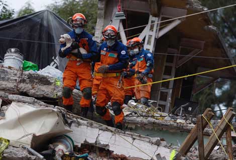 Brigadistas de Japón lograron sacar a un perro de entre los escombros del edificio colapsado en el multifamiliar de calzada de Tlalpan. En el lugar han sido rescatadas seis personas con vida y nueve fallecidas. El coordinador nacional de Protección Civil, Luis Felipe Puente, informó ayer que ascendió a 320 la cifra general de decesos por el sismo de 7.1 grados del pasado 19 de septiembre Foto Cristina Rodríguez