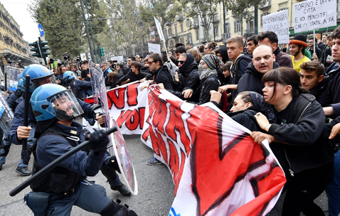 Cientos de manifestantes contrarios a la globalización se enfrentaron a policías en la ciudad italiana de Turín, en su intento por llegar al sitio donde se realiza la reunión del Grupo de los Siete países más industrializados, en la que se analizan temas laborales. Las protestas se enfocaron contra los empleos mal pagados y los contratos de corto plazo. Algunos de los inconformes lanzaron bombas de humo y petardos contra los agentes de seguridad, con saldo de varios heridos Foto Ap