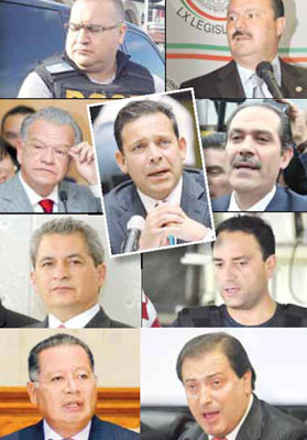 En ninguna administración federal tantos gobernadores habían estado sujetos a proceso penal, y la mayoría encarcelados por delitos como lavado de dinero, peculado, defraudación fiscal y nexos con el crimen. De izquierda a derecha: Javier Duarte (preso), César Duarte (prófugo), Andrés Granier (preso), Guillermo Padrés (preso), Tomás Yarrington (en proceso de extradición, Roberto Borge (en proceso de extradición), Flavino Ríos (preso) y Armando Reynoso Femat (proceso en libertad). Al centro, Eugenio Hernández Fotos La Jornada, Cuartoscuro y agencias