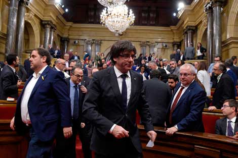Carles Puigdemont, presidente de Cataluña (al centro), abandona el Parlamento regional tras su comparecencia. En la sesión de este viernes se votará poner en marcha nuevamente la hoja de ruta para la declaración unilateral de independencia. En Madrid se da por hecho que el Senado aplicará este viernes el artículo 155 constitucional para destituir al gobierno catalán y controlar los medios públicos de información y a la policía autonómica Foto Afp