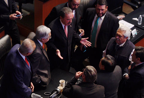 Emilio Gamboa Patrón, coordinador de la bancada del PRI en el Senado, dialoga con dirigentes de partidos de oposición. Ayer, en una ríspida sesión, fueron aprobadas las reformas al Instituto Federal de Telecomunicaciones que restan competencia al organismo para multar a concesionarios cuando se rebasen topes de transmisión de publicidad establecidos por ley Foto Cristina Rodríguez