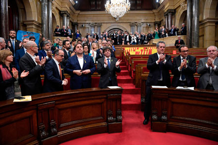 Carles Puigdemont, presidente catalán, aplaude (centro) luego de que el Parlamento votó la declaratoria de independencia de la región, ayer en Barcelona. La resolución legislativa anotó: