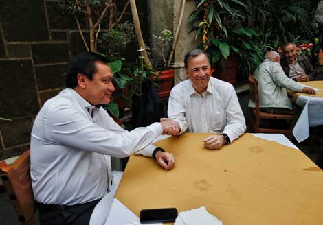 Miguel Ángel Osorio Chong, secretario de Gobernación, y José Antonio Meade, ex titular de Hacienda y aspirante externo a la candidatura presidencial por el PRI, conversaron en el restaurante Puerto Chico, uno de los comederos más concurridos por la clase política Foto Marco Peláez