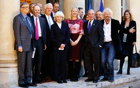 El millonario Bill Gates (izquierda), sir Richard Branson (derecha) y Michael Bloomberg (penúltimo en la primera fila), enviado especial de la ONU para el Cambio Climático, participaron en la reunión de la Fundación Filantrópica para Financiar Proyectos Ambientales, como parte de la cumbre de jefes de Estado y de gobierno convocada en la capital francesa. En el encuentro, el presidente Emmanuel Macron advirtió. Estamos perdiendo la batalla. Las medidas necesarias para frenar el cambio climático no se están aplicando con la suficiente celeridad y muchos países pueden desaparecer Foto Ap