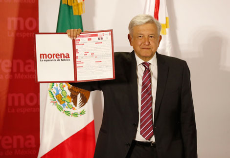 Andrés Manuel López Obrador muestra su registro como precandidato de Morena a la Presidencia de la República. En el acto expuso el proyecto de nación que elaboró su partido. En el tema económico, señaló que el gobierno federal sería promotor del desarrollo y fortalecimiento del mercado interno, lo cual no implicaría más impuestos ni mayor endeudamiento Foto Carlos Ramos Mamahua