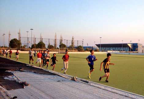 En Elliniko, en las afueras de Atenas (en la imagen), fueron construidas instalaciones deportivas para los Juegos Olímpicos de 2004 en terrenos del antiguo aeropuerto. El espacio quedó más tarde en desuso y en la crisis de refugiados fue utilizado para albergar a cientos de desplazados de Medio Oriente. Los ahora residentes, sobre todo niños, aprovechan la zona para practicar deportes, sobre todo futbol Foto Muzungu Producciones
