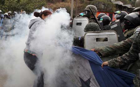 Soldados impidieron este sábado el bloqueo de carreteras en varios puntos del país, convocado por la Alianza de Oposición contra la Dictadura en el contexto de las protestas contra la toma de posesión de Juan Orlando Hernández, prevista para el día 27, tras su controvertida relección en los comicios de noviembre, cuando disputó el cargo con Salvador Nasralla, quien argumenta que hubo fraude. Los enfrentamientos dejaron al menos un muerto. La imagen, en Tegucigalpa Foto Ap