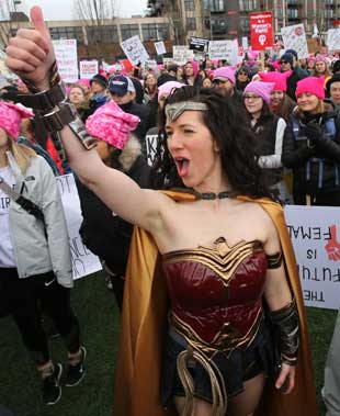 Cientos de miles marcharon este sábado en varias ciudades de Estados Unidos en repudio a Donald Trump y contra el hostigamiento sexual, que ha llegado a casi todos los ámbitos del poder, incluida la Casa Blanca. Coaliciones de defensa de migrantes y refugiados, organizaciones de derechos civiles, sindicatos y estudiantes acompañaron la protesta de mujeres. La imagen, en Seattle Foto Afp