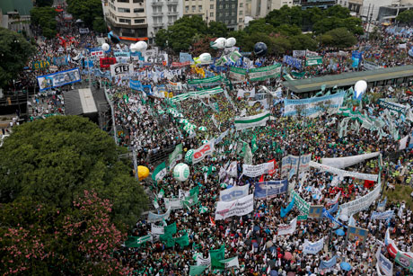 Cientos de miles de personas, convocadas por los principales sindicatos y organizaciones sociales argentinos, marcharon por las calles de Buenos Aires para rechazar las acciones del mandatario contra los derechos laborales y para exigir que se reviertan los despidos masivos. Demandaron que haya negociaciones salariales sin topes y que se echen abajo los ajustes en jubilaciones Foto Ap