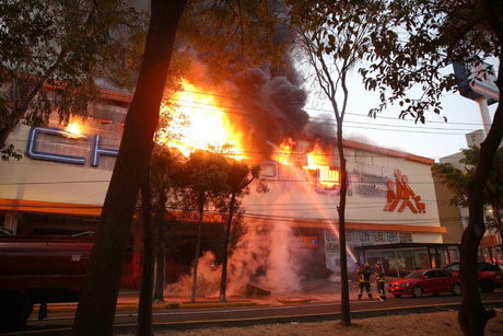 Tres incendios redujeron ayer a cenizas un centro comercial (imagen) ubicado en Plaza Tepeyac; 250 locales del mercado Hidalgo, en la colonia Doctores, y una bodega con productos de limpieza, en Eje 6 Sur y Carlos L. Glacidas. El combate a esta última conflagración dejó 11 bomberos intoxicados, quienes requirieron hospitalización Foto Cuartoscuro