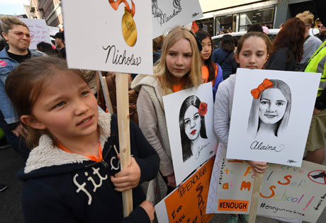 Con el lema Bienvenidos a la revolución; nosotros somos el cambio, cientos de miles participaron este sábado en más de 800 acciones contra las armas en varias ciudades de Estados Unidos y en al menos 30 países, a las que convocó la Marcha por nuestras vidas, encabezada por sobrevivientes de la masacre en la preparatoria Douglas, de Parkland, Florida, donde el mes pasado fueron asesinados 14 estudiantes y tres maestros por un ex alumno. Voten para botar a los políticos, corearon los participantes, en exigencia de que las autoridades impongan mayor control a la venta de armas de fuego, en un país donde fallecen tiroteadas 96 personas cada día, en promedio. La imagen, en Los Ángeles, California Foto Afp