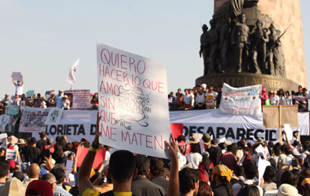 ¿Dónde están nuestros hijos?, clamaron familiares y amigos de víctimas durante la marcha realizada este sábado en Guadalajara en protesta por la oleada de desapariciones en el estado, donde la semana pasada se reportaron seis casos (ya localizaron a dos). El detonante de las protestas fue la privación forzosa de la libertad de tres estudiantes de cine de la Universidad de Medios Audiovisuales, a quienes se llevó un comando armado. El colectivo Familias Unidas tiene documentados por lo menos 3 mil 723 casos en la entidad Foto Arturo Campos Cedillo
