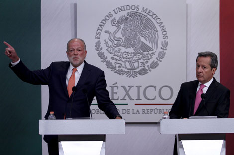 Federico Patiño Márquez, director general del Grupo Aeroportuario de Ciudad de México (izquierda, en la imagen), señaló en conferencia de prensa en Los Pinos que la nueva terminal aérea tiene un avance de 45 por ciento y que no está concebida como un programa de gobierno, sino con sentido de Estado. En el acto participó Eduardo Sánchez, vocero del gobierno de la República Foto María Luisa Severiano