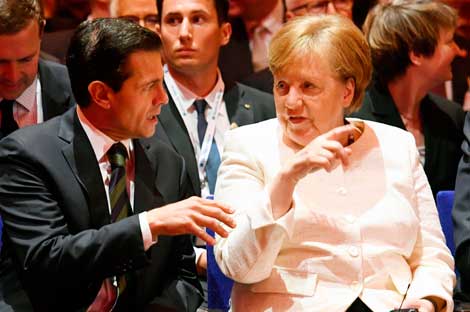La canciller alemana Angela Merkel y el presidente Enrique Peña Nieto encabezaron ayer la inauguración de la Feria Industrial de Hannover, en donde México acude como país socio. En el encuentro, el dirigente de la Federación Alemana de Ingeniería, Carl Martin Welcker, enunció un fallido juego de palabras sobre la participacion que tendrán las selecciones de ambas naciones en el Mundial de Rusia 2018 y el muro impulsado por Donald Trump, a lo que el mandatario mexicano atajó: celebro que nos volveremos a encontrar unidos por un balón de futbol. Y no serán los muros los que guarden las porterías; será el talento futbolístico lo que se dejará sentir y ver Foto Afp