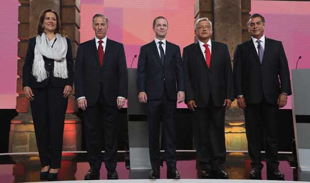 Margarita Zavala, José Antonio Meade, Ricardo Anaya, Andrés Manuel López Obrador y Jaime Rodríguez Calderón momentos antes del primer debate Foto del Instituto Nacional Electoral