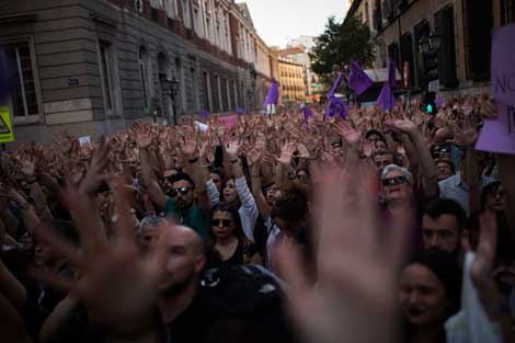no es abuso, es violación, miles de personas y colectivos feministas se manifestaron en varias ciudades españolas (Madrid, en la imagen) para expresar su repudio a la sentencia de la Audiencia Provincial de Navarra contra cinco jóvenes. Los hechos ocurrieron en las tradicionales fiestas de San Fermín, en 2016, cuando la víctima, entonces de 18 años, se topó en la madrugada con cinco sujetos ebrios que abusaron de ella y grabaron el ataque. Cuatro jueces, entre ellos una mujer, hallaron culpables a los acusados del delito de agresión sexual, pero no de violación Foto Ap
