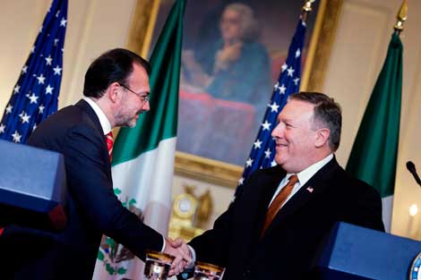 El secretario de Relaciones Exteriores, Luis Videgaray, y el secretario de Estado estadunidense, Mike Pompeo, se reunieron ayer en Washington. El funcionario mexicano y el titular de Economía, Ildefonso Guajardo, iniciaron ayer una visita de trabajo en la cual abordan los avances en las negociaciones para modernizar el Tratado de Libre Comercio de Norteamérica Foto Afp