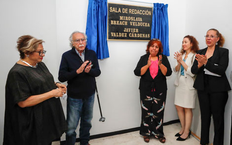 En una ceremonia vibrante, cargada de emociones, desde ayer el octavo piso de La Jornada se denomina Sala de Redacción Miroslava Breach Velducea y Javier Valdez Cárdenas, en memoria de nuestros compañeros ultimados el año pasado. Griselda Triana, viuda de Javier, y Rosy y Mirabel Breach, hermanas de Miroslava, corresponsales en Sinaloa y Chihuahua, respectivamente, develaron la placa en presencia de la directora general, Carmen Lira, y el director fundador, Carlos Payán Foto Carlos Ramos Mamahua