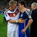 El astro albiceleste no pudo ganar su primer Mundial, aunque se fue con el consuelo de ser designado el mejor jugador de la Copa. En la imagen, el mediocampista alemán Bastian Schweinsteiger lo consuela de la derrota 1-0 Foto Afp