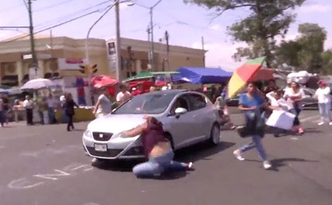 Imagen tomada de un video en el momento en que el conductor de un automóvil arrolla a una señora que participaba en un bloqueo en la avenida Ermita Iztapalapa y San Lorenzo, en protesta por la escasez de agua en la delegación Iztapalapa; en su huída lesionó a dos personas más. El sujeto, de 24 años, fue aprehendido poco después y trasladado al Ministerio Público. Foto La Jornada