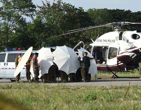 ▲ Policías y militares cubren con sombrillas a uno de los cuatro menores rescatados ayer de una kilométrica y serpenteante cueva en Tailandia, luego de ser trasladado en helicóptero a la ciudad de Chiang Rai para su hospitalización. Los especialistas en buceo en cavernas manifestaron que es una de las operaciones más difíciles que se haya realizado en el mundo. Foto Afp