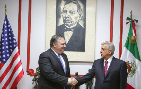 Les damos la bienvenida. Ustedes tienen la palabra, dijo Andrés Manuel López Obrador a la comitiva de primer nivel enviada por Donald Trump, la cual fue encabezada por el secretario de Estado, Mike Pompeo (izquierda). Antes, los funcionarios estadunidenses se reunieron en Los Pinos con el presidente Enrique Peña Nieto, encuentro al que asistieron el canciller, Luis Videgaray; los secretarios de Gobernación, Alfonso Navarrete, y de Hacienda, José Antonio González, y el embajador en Estados Unidos, Gerónimo Gutiérrez. Foto Ap