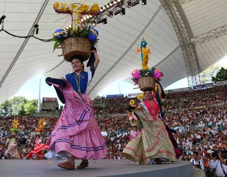 ◀ El auditorio ubicado en el cerro del Fortín, de la ciudad de Oaxaca, recibió a 11 mil espectadores para disfrutar de la Guelaguetza. En el segundo Lunes del Cerro desfi laron 14 delegaciones procedentes de las ocho regiones del estado, entre ellas la de Juchitán, que portó atavíos negros en señal de duelo por las víctimas del sismo de septiembre del año pasado. El gobernador Alejandro Murat Hinojosa destacó que la fiesta ha generado recursos que se invertirán en obra social. Foto Jorge A. Pérez Alfonso