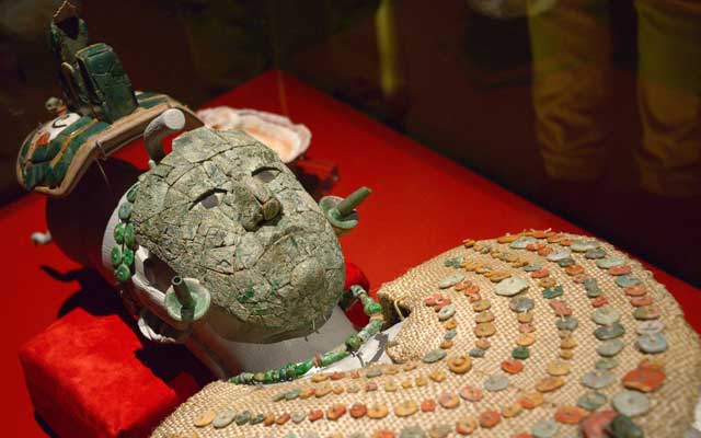 ▲ Gracias al trabajo del INAH, el Templo Mayor, en el corazón de la Ciudad de México, recibe a la Reina Roja de Palenque. Los muros teñidos de carmesí profundo rodean la reproducción de un templo para exhibir el ajuar con el que fue enterrada hace más de mil 300 años y el sarcófago en sus dimensiones originales. El atavío fúnebre de Tz’ak-b’u Aja, esposa de Pakal El Grande, el más importante gobernante de esa época, es clave para abordar la cosmovisión maya en torno al inframundo. La recreación del entierro pretende resaltar los accesorios y joyas que vestía la también sacerdotisa. Foto INAH
