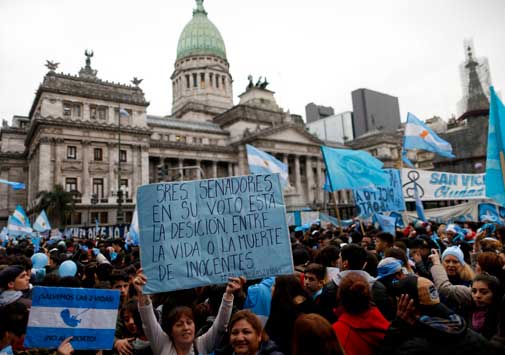 ◀ Al cierre de esta edición aún no se realizaba la votación en el Senado sobre la despenalización del aborto, pero todo indicaba, tras un maratónico debate, que 38 senadores votarán en contra, 31 en favor y habrá una abstención. Afuera del Congreso se mantenía una vigilia entre los verdes, quienes apoyan el , y los celestes, quienes respaldan el no. Foto Ap